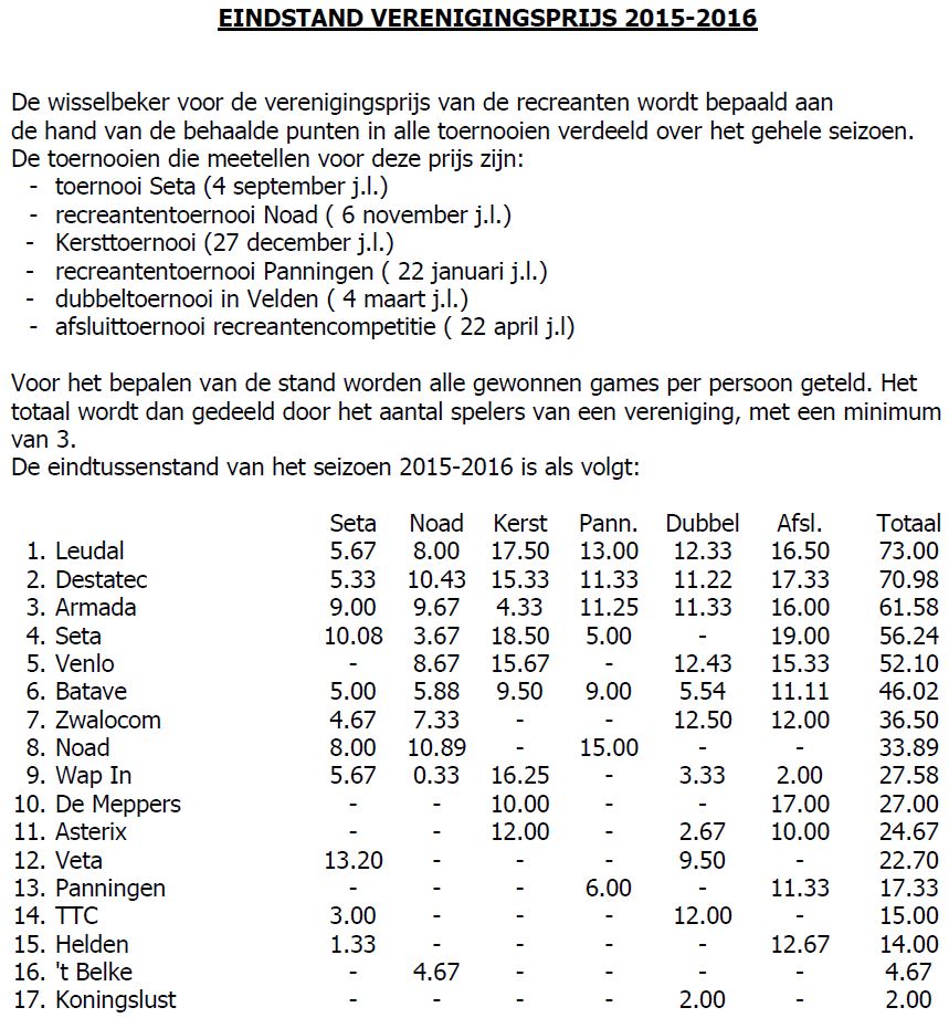 Leudal winnaars verenigingsbeker 2015-2016