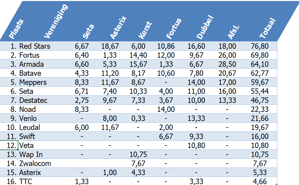 Voor het bepalen van de stand worden alle gewonnen games per persoon geteld. Het totaal wordt dan gedeeld door het aantal spelers van een vereniging, met een minimum van 3.